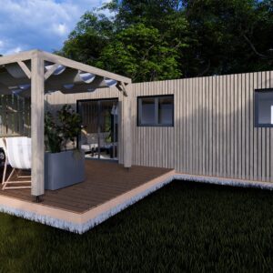 Terrasse + pergola + voilage + bardage terrasseToiture 2 pansToiture végétaliséePompe à chaleur air-airPanneau photovoltaïquePack pompe à chaleur air airVolets roulants