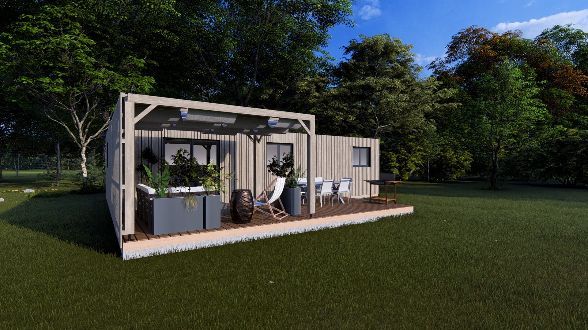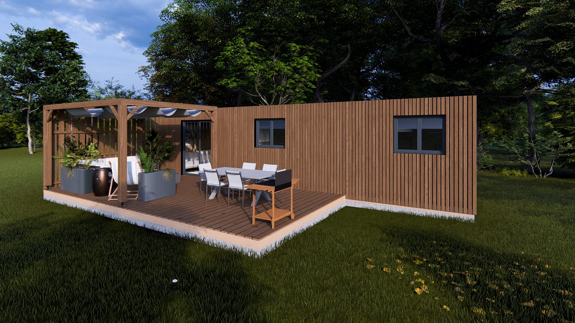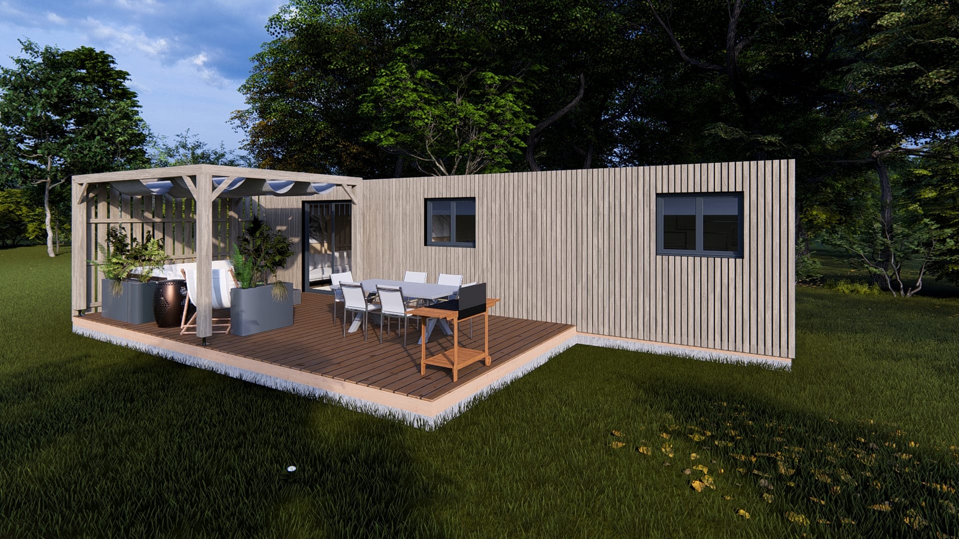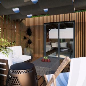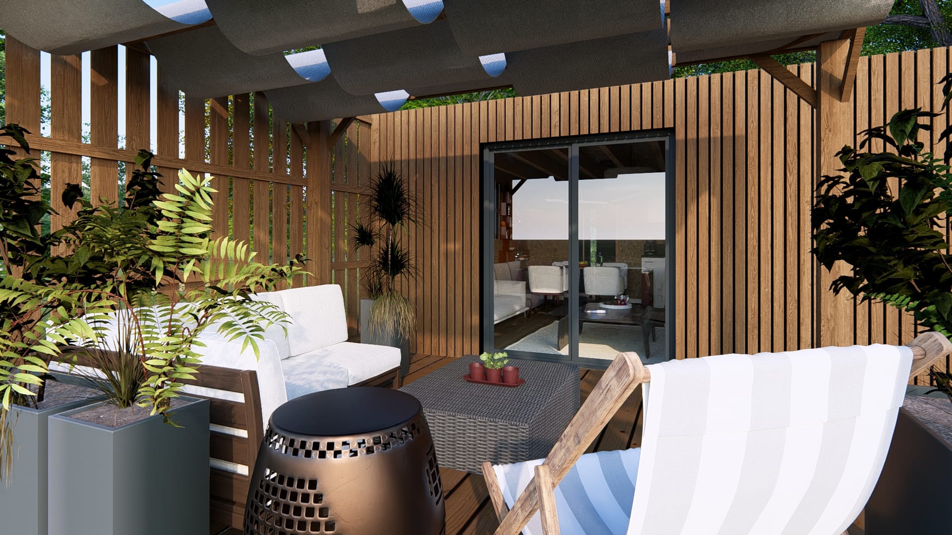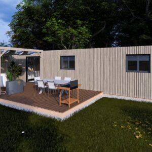 • Terrasse + pergola + voilage + bardage terrasse